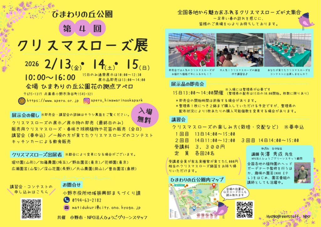 内容:クリスマスローズの展示、展示物の即売(最終日のみ)、販売用クリスマスローズや春咲き球根植物、花苗の販売(全日)、講習会、一般の方が育てたクリスマスローズのコンテスト、キッチンカー等による飲食販売です。